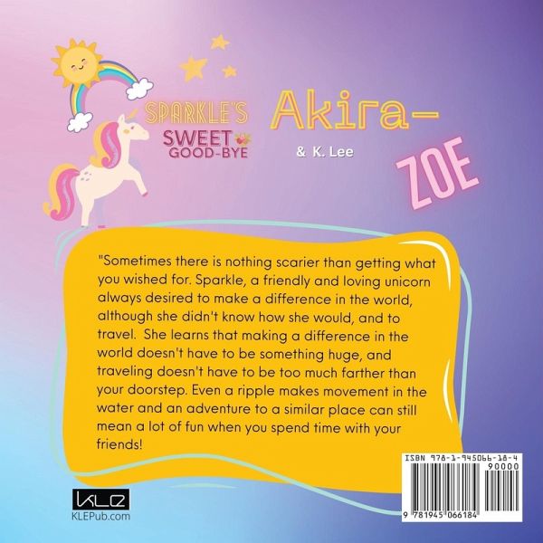 The First Book from Akira-Zoe a 9-year girl and K. Lee. This writing team duo writes the story of a friendly unicorn, Sparkle, who desires to change the world and travel. She is not sure how everything will pan out but learns to trust the process. "Sometimes there is nothing scarier than getting what you wished for. Sparkle, a friendly and loving unicorn always desired to make a difference in the world, although she didn't know how she would, and to travel. She learns that making a difference in the world doesn't have to be something huge, and traveling doesn't have to be too much farther than your doorstep. Even a ripple makes movement in the water and an adventure to a similar place can still mean a lot of fun when you spend time with your friends!