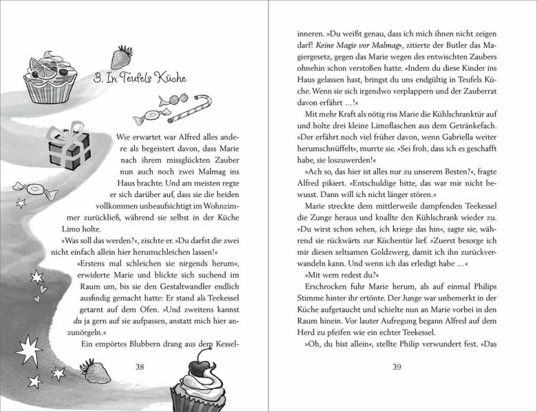 Mir hat diese zauberhafte Geschichte sehr gut gefallen, insbesondere die liebenswerte Protagonistin Marie, die trotz ihrer Schwäche für süße Leckereien unglaublich sympathisch wirkt. Die originelle Beschreibung der Magie mit all den Sparkles, die ein riesiges Chaos anrichten können, hat mich ebenfalls begeistert. Insgesamt entführt dieses Buch den Leser auf eine faszinierende Reise in eine magische Welt voller Herausforderungen, die Marie und Phillip mit Mut und Einfallsreichtum meistern müssen. Die liebenswerten und originellen Charaktere, die originelle Beschreibung der Magie und die unerwarteten Wendungen machen die Geschichte zu einem wahren Lesevergnügen.
