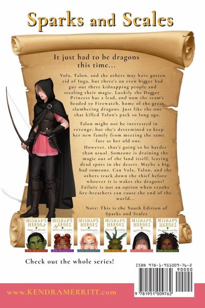 It just had to be dragons this time... Vola, Talon, and the others may have gotten rid of Inga, but there's an even bigger bad guy out there stealing magic out of the land and its people. Luckily the Dagger Princess has a lead, and now the team's headed to Firewatch, home of the great slumbering dragons. Just like the one that killed Talon's pack so long ago. Talon might not be interested in revenge but she's determined to keep her new family from meeting the same fate as her old one. However, that's going to be harder than usual. Someone is draining the magic out of the land itself, leaving dead spots in the desert. Maybe a big bad someone. Can Vola, Talon, and the others track down the thief before whoever it is wakes the dragons? Failure is not an option when cranky fire-breathers can cause the end of the world... Note: This is the Youth Edition of Sparks and Scales. Appropriate for ages 8-12