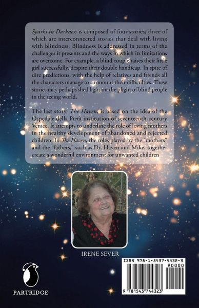 Sparks in Darkness is composed of four stories, three of which are interconnected stories that deal with living with blindness. Blindness is addressed in terms of the challenges it presents and the ways in which its limitations are overcome. For example, a blind couple raises their little girl successfully, despite their double handicap. In spite of dire predictions, with the help of relatives and friends all the characters manage to surmount their difficulties. These stories may perhaps shed light on the plight of blind people in the seeing world. The last story, The Haven, is based on the idea of the Ospedale della Piet institution of seventeenth-century Venice. It attempts to underline the role of loving mothers in the healthy development of abandoned and rejected children. In The Haven, the roles played by the mothers and the fathers, such as Dr. Haven and Mike, together create a wonderful environment for unwanted children