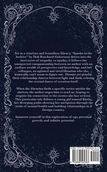 Set in a timeless and boundless library, "Sparks in the Archive" by Didi Bouchard-Gehorsam delves into the intricacies of empathy vs apathy; it follows the unexpected companionship between an author with an endless wealth of perspective and knowledge, and her colleague, an agitated and tired librarian who she, ironically, can't seem to figure out. Distant yet playful, their relationship dances between light and dark, echoing the eternal dance of creation itself. When the librarian finds a specific series amidst the shelves, the author urges him to read on, hoping to reignite his connection to the stories she has written. This particular tale follows a young girl named Birdie, her diverging paths showing her navigation through the trials of mental health and budding relationships in a foreign country. Immerse yourself in this exploration of ego, personal growth, and infinite potential.