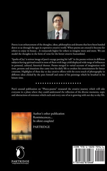 Poetry is an enhancement of the thoughts, ideas, philosophies and dreams that have been handed down to us through the ages in expressive creative world. When poems are created it become for others to enjoy its beauty...It transcends higher for others to imagine more and more. We can model the thoughts in the form of verse for the better creative humankind. 'Sparks of Joy' is mirror image of poet's voyage putting his 'self ' in the poems written in different subjects having spiritual touch in most of them with large yield displayed wide range of influences in personal, cultural, historical themes. Poems merged in varied account of imagination with time, persons and situations that came into his daily life to awaken his consciousness for better creations. Highlights of these day to day creative efforts with the extra touch of photography in different ideas clicked by the poet himself and some of his paintings which he brushed in his leisure time.