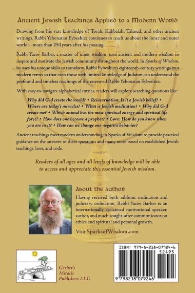Ancient Jewish Teachings Applied to a Modern World Drawing from his vast knowledge of Torah, Kabbalah, Talmud, and other ancient writings, Rabbi Yehonatan Eybeshitz continues to teach us about the inner and outer world-more than 250 years after his passing. Rabbi Yacov Barber, a master of inner wisdom, uses ancient and modern wisdom to inspire and motivate the Jewish community throughout the world. In Sparks of Wisdom, he uses his unique skills to transform Rabbi Eybeshitz's eighteenth-century writings into modern terms so that even those with limited knowledge of Judaism can understand the profound and timeless teachings of the esteemed Rabbi Yehonatan Eybeshitz. With easy-to-navigate alphabetical entries, readers will explore searching questions like:Why did G-d create the world? Reincarnation: Is it a Jewish belief? Where are today's miracles? What is Jewish meditation? Why did G-d create me? Which animal has the most spiritual energy and spiritual life force? How does one become a prophet? Love: How do you know when you are in it? How can we change our negative behavior? Ancient teachings meet modern understanding in Sparks of Wisdom to provide practical guidance on the answers to these questions and many more based on established Jewish teachings, laws, and code. Readers of all ages and all levels of knowledge will be able to access and appreciate this essential Jewish wisdom.