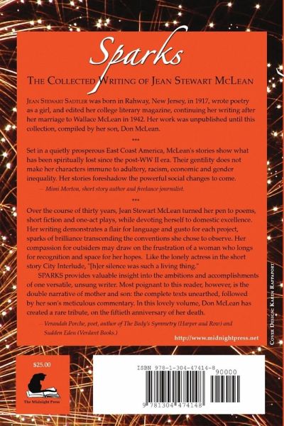 Fifty years after her death in 1963, Jean Stewart McLean's poems, short stories, and one-act plays are published for the first time, in a definitive collection, edited and with extensive photos and commentary by her son, Don McLean. The author was born in 1917 in Rahway, N.J., growing up in the rectory of the church where her father was minister. Two of the plays in this book are set in small-town parishes. She wrote poetry as a girl, and at New Jersey College for Women studied literature and edited the literary magazine. Upon graduation, she was secretary to the editor of the Book of the Month Club in New York City, reveling in the literary atmosphere. She chose domestic life after marriage, settling in Princeton, N.J., and continued writing, primarily short stories and one-act plays. One of her stories was co-authored with her mentor, Dorothy Thomas. Her work was unpublished during her short lifetime, making the appearance of this collection particularly meaningful.