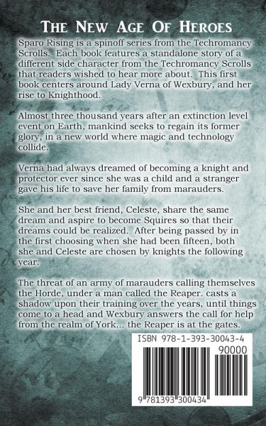 Sparo Rising is a spinoff series from the Techromancy Scrolls. Each book features a standalone story of a different side character from the Techromancy Scrolls that readers wished to hear more about. This first book centers around Lady Verna of Wexbury, and her rise to Knighthood. Almost three thousand years after an extinction level event on Earth, mankind seeks to regain its former glory, in a new world where magic and technology collide. Verna had always dreamed of becoming a knight and protector ever since she was a child and a stranger gave his life to save her family from marauders. She and her best friend, Celeste, share the same dream and aspire to become Squires so that their dreams could be realized. After being passed by in the first choosing when she had been fifteen, both she and Celeste are chosen by knights the following year. The threat of an army of marauders calling themselves the Horde, under a man called the Reaper. casts a shadow upon their training over the years, until things come to a head and Wexbury answers the call for help from the realm of York... the Reaper is at the gates.