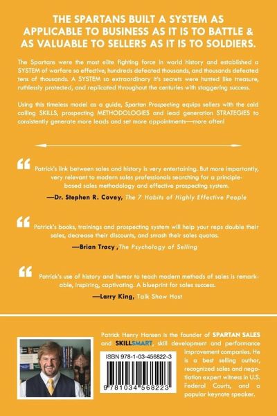 Patrick Henry Hansen's Spartan Prospecting draws on some of history's most compelling moments to teach modern prospecting principles--Aristotle's banishment from Plato's Academy, Robert Bruce's victory at the battle of Bannockburn, mountain man John Colter's miraculous escape from Blackfeet Indians, and more. Beginning each chapter with a captivating historical event, Spartan Prospecting both informs and entertains. Build a B2B pipeline, improve teleprospecting and selling skills, increase lead generation, referrals, and executive networking.