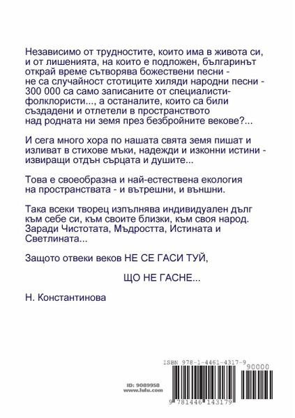 Ce troisième livre de la collection "Amitiés cachées au fond du coeur" unit une partie des oeuvres de huit poètes bulgares contemporains qui font leurs vers dans la solitude et en silence pour analyser leur vie et pour trouver les nouvelles dimensions spirituelles de l'Avenir. ¿ ¿¿¿¿ ¿¿¿¿¿ ¿¿¿¿¿ ¿¿ ¿¿¿¿¿¿¿¿¿¿ ¿¿ ¿¿¿¿¿¿¿¿ ¿¿¿¿¿¿ ¿¿ ¿¿¿¿ ¿¿¿¿¿, ¿¿¿¿¿ ¿¿¿¿¿¿¿ ¿ ¿¿¿¿¿¿ ¿¿¿¿¿¿¿¿¿¿ ¿¿¿¿¿¿¿ ¿¿ ¿¿ ¿¿ ¿¿ ¿¿¿¿¿¿¿¿, ¿ ¿¿ ¿¿ ¿¿¿¿¿¿¿¿¿¿¿ ¿¿¿¿¿¿ ¿¿ ¿ ¿¿ ¿¿¿¿¿¿¿ ¿¿¿¿¿¿ ¿¿¿¿¿¿¿ ¿¿¿¿¿¿¿¿¿.