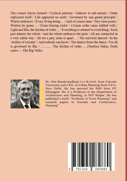 The cosmic forces formed / Cyclical patterns / Galactic to sub-atomic / Order replicated itself / Life appeared on earth / Governed by one grand principle / Which embraces / Every living being... / And of course man / Very terse poem / Written by genes... / From blazing Ardor / Cosmic order came riddled with / Light and Rta, the rhythm of order... / Everything is attuned to everything / Each part inheres the whole / And the whole embraces the parts / All are connected in a very subtle way / All are a part, none is apart... / The universe danced / In the 'artifice of eternity' / And nobody can know / The dancer from the dance / For all is governed by Rta / .......... The rhythm of order.... (Nasdiya Sukta, Tenth canto: -The Rig Veda).