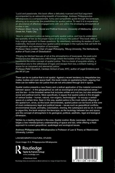 'Flinging far-fetched fescues of wit at the atmospherics of lawscapes, the poet-jurist Philippopoulos-Mihalopoulos unflinchingly enters the bubble of law and eloquently transforms the entire concept of spatial justice. This is a book of exquisite artistry, a theoretical aria to the withdrawal of logos and escape from law, a brilliant making of space for an immanent and elemental justice.'