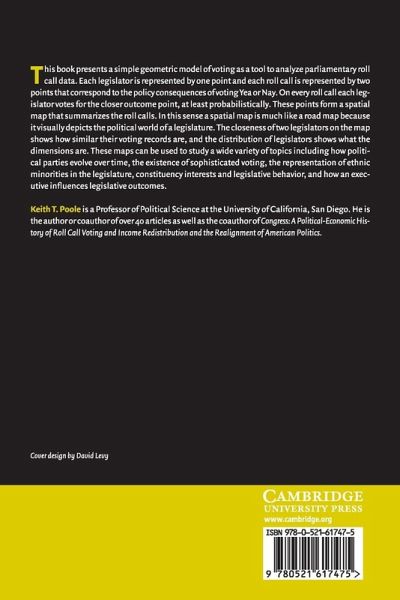 This book presents a simple geometric model of voting as a tool to analyze parliamentary roll call data. Each legislator is represented by one point and each roll call is represented by two points that correspond to the policy consequences of voting Yea or Nay. On every roll call each legislator votes for the closer outcome point, at least probabilistically. These points form a spatial map that summarizes the roll calls. In this sense a spatial map is much like a road map because it visually depicts the political world of a legislature. The closeness of two legislators on the map shows how similar their voting records are, and the distribution of legislators shows what the dimensions are. These maps can be used to study a wide variety of topics including how political parties evolve over time, the existence of sophisticated voting and how an executive influences legislative outcomes.