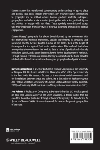 Doreen Massey has transformed contemporary understandings of space, place and politics. This book critically interrogates her ground-breaking contributions to geography and to political debate. Former graduate students, colleagues, geographers and other social scientists, join together with artists, political figures and activists to engage with her ideas. These specially commissioned essays take their inspiration from her style of rigorous theorizing animated by political engagement. Doreen Massey's geography has always been informed by her involvement with the international women's movement, socialist experiments in Venezuela and Nicaragua and the Greater London Council of the 1980s, then at the height of its rearguard action against Thatcherite neoliberalism. This landmark text offers a comprehensive overview of her work to date, a series of political and scholarly reflections upon it, and a set of directions for the further development of her ideas. Through serious reflection on Doreen Massey's contributions the book provides intellectual tools and resources for re-shaping our geographical and political futures.