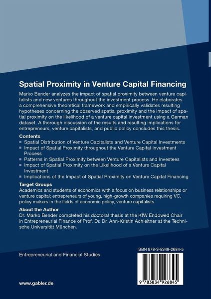 Marko Bender analyzes the impact of spatial proximity between venture capitalists and new ventures throughout the investment process. He elaborates a comprehensive theoretical framework and empirically validates resulting hypotheses concerning the observed spatial proximity and the impact of spatial proximity on the likelihood of a venture capital investment using a German dataset. A thorough discussion of results and resulting implications for entrepreneurs, venture capitalists, and public policy concludes this thesis.
