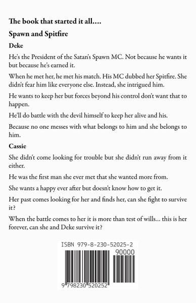The book that started it all.... Spawn and Spitfire Deke He's the President of the Satan's Spawn MC. Not because he wants it but because he's earned it. When he met her, he met his match. His MC dubbed her Spitfire. She didn't fear him like everyone else. Instead, she intrigued him. He wants to keep her but forces beyond his control don't want that to happen. He'll do battle with the devil himself to keep her alive and his. Because no one messes with what belongs to him and she belongs to him. Cassie She didn't come looking for trouble but she didn't run away from it either. He was the first man she ever met that she wanted more from. She wants a happy ever after but doesn't know how to get it. Her past comes looking for her and finds her, can she fight to survive it? When the battle comes to her it is more than test of wills... this is her forever, can she and Deke survive it?