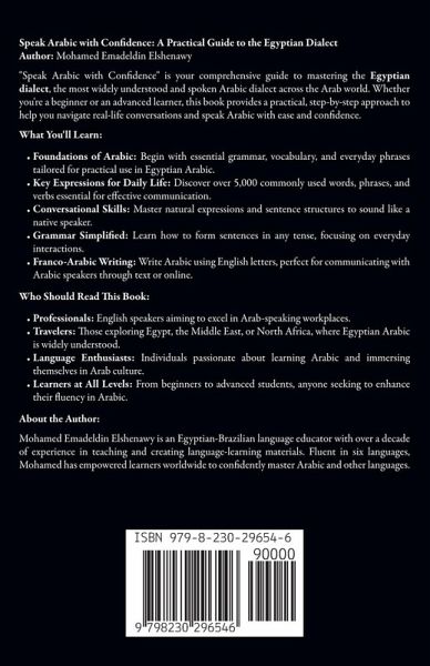 Speak Arabic with Confidence: A Practical Guide to the Egyptian Dialect Author: Mohamed Emadeldin Elshenawy "Speak Arabic with Confidence" is your comprehensive guide to mastering the Egyptian dialect, the most widely understood and spoken Arabic dialect across the Arab world. Whether you're a beginner or an advanced learner, this book provides a practical, step-by-step approach to help you navigate real-life conversations and speak Arabic with ease and confidence. What You'll Learn:Foundations of Arabic: Begin with essential grammar, vocabulary, and everyday phrases tailored for practical use in Egyptian Arabic. Key Expressions for Daily Life: Discover over 5,000 commonly used words, phrases, and verbs essential for effective communication. Conversational Skills: Master natural expressions and sentence structures to sound like a native speaker. Grammar Simplified: Learn how to form sentences in any tense, focusing on everyday interactions. Franco-Arabic Writing: Write Arabic using English letters, perfect for communicating with Arabic speakers through text or online. Who Should Read This Book:Professionals: English speakers aiming to excel in Arab-speaking workplaces. Travelers: Those exploring Egypt, the Middle East, or North Africa, where Egyptian Arabic is widely understood. Language Enthusiasts: Individuals passionate about learning Arabic and immersing themselves in Arab culture. Learners at All Levels: From beginners to advanced students, anyone seeking to enhance their fluency in Arabic. About the Author: Mohamed Emadeldin Elshenawy is an Egyptian-Brazilian language educator with over a decade of experience in teaching and creating language-learning materials. Fluent in six languages, Mohamed has empowered learners worldwide to confidently master Arabic and other languages. "Speak Arabic with Confidence" simplifies your journey to fluency in Egyptian Arabic, equipping you with the tools to communicate effectively and naturally. Start speaking Arabic today!