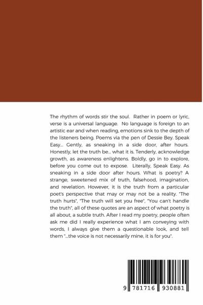 Speak Easy 101, Poems by Dessie Bey is an eclectic mix of poetry from a women's innate perspective. So much so chapters had to be used to give it rhyme and reason. A Woman's World; Emotions; Ways of the World; and Rhythm & Blues are a few chapters that escape the center of Dessie's soul just for the hell of it. There are poems that will make you laugh out loud and poems that will make you cry alone. All is all, it's a pleasurable read.