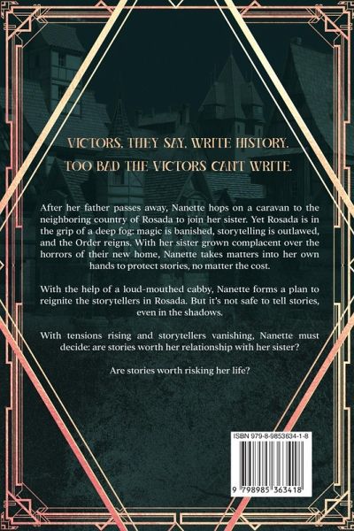Victors, they say, write history. Too bad the victors can't write. After her father passes away, Nanette hops on a caravan to the neighboring country of Rosada to join her sister. Yet Rosada is in the grip of a deep fog: magic is banished, storytelling is outlawed, and the Order reigns. With her sister grown complacent over the horrors of their new home, Nanette takes matters into her own hands to protect stories, no matter the cost. With the help of a loud-mouthed cabby, Nanette forms a plan to reignite the storytellers in Rosada. But it's not safe to tell stories, even in the shadows. With tensions rising and storytellers vanishing, Nanette must decide: are stories worth her relationship with her sister? Are stories worth risking her life? This book is rated 18+ for language, sexual situations, violence, police brutality, mentions of suicide, and trauma.