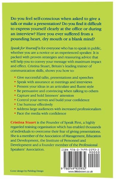 Do you feel self-conscious when asked to give a talk or make a presentation? Do you find it difficult to express yourself clearly at the office or during an interview? Have you ever suffered from a pounding heart, dry mouth or blank mind? Speak for Yourself is for everyone who has to speak in public, whether you are a novice or an experienced speaker. It is packed with proven strategies and reassuring advice that will help you to convey your message with maximum impact and effect. Cristina Stuart, Britain's leading trainer of communication skills, shows you how to: * Give successful talks, presentations and speeches * Speak with assurance at meetings and interviews * Present your ideas in an articulate and fluent style * Be persuasive and convincing when talking to others * Capture and hold listeners' attention * Control your nerves and build your confidence * Use humour effectively * Address large audiences with increased professionalism * Face the media with confidence