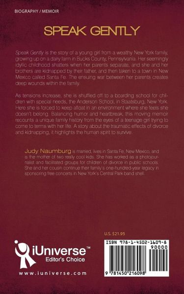 Speak Gently is the story of a young girl from a wealthy New York family, growing up on a dairy farm in Bucks County, Pennsylvania. Her seemingly idyllic childhood shatters when her parents separate, and she and her brothers are kidnapped by their father, and then taken to a town in New Mexico called Santa Fe. The ensuing war between her parents creates deep wounds within the family. As tensions increase, she is shuffled off to a boarding school for children with special needs, the Anderson School, in Staatsburg, New York. Here she is forced to keep afloat in an environment where she feels she doesn't belong. Balancing humor and heartbreak, this moving memoir recounts a unique family history from the eyes of a teenage girl trying to come to terms with her life. A story about the traumatic effects of divorce and kidnapping, it highlights the human spirit to survive.