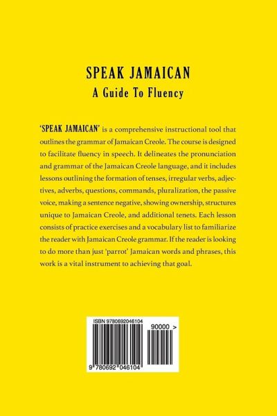 'SPEAK JAMAICAN' is a comprehensive instructional tool that outlines the grammar of Jamaican Creole. It is designed for the English speaker who wishes to speak fluent Jamaican Creole as opposed to "parroting" words and phrases. The book includes 21 lessons that delve extensively into the pronunciation, syntax, and parts of speech of Jamaican Creole. A simple, consistent pronunciation and alphabetical system is outlined in the book for effortless speaking and writing. The rules governing pronunciation and syntax are included as well as information that will help the reader to understand how these rules came about. 'SPEAK JAMAICAN' outlines the tenses of Jamaican Creole, including regular, irregular, and infinitive verb formations. Jamaican Creole tenses, although generally simple and consistent, can have multiple verb formations. In addition, the dialect can vary slightly in different parishes of the country. These variations and alternative verb formations are considered when addressing the tenses of Jamaican Creole. A discussion of the formation of plural adjectives, adverbs, nouns, and pronouns is included in this book. The book also discusses the passive voice, making a sentence negative, asking questions, showing ownership, forming adjectives and adverbs, giving commands, and grammatical structures unique to Jamaican Creole. Each lesson has a vocabulary list and practice exercises that utilize words most commonly used in everyday conversations. The reader is also introduced to Jamaican proverbs. These are essential to the character of the dialect as these are sewn seamlessly into everyday conversations. Reading comprehensions that are a culmination of the tenets of Jamaican Creole grammar are included to help the reader to improve their reading ability. The book also includes a list of frequently asked questions, commonly used expressions, and a sample of Jamaican Creole verbs conjugated by tense.