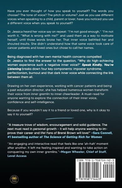 Have you ever thought of how you speak to yourself? The words you choose? The tone of voice? The pitch or volume? Just as you use different voices when speaking to a child, parent or lover, have you noticed you use a different voice when you speak to yourself? Dr. Jessica heard her voice say on repeat: "I'm not good enough," "I'm not worth it, "What is wrong with me?" and used them as a way to motivate herself, until those words broke her. That inner voice belittled her and shouted insults. She didn't understand how that same voice took care of cancer patients and loved ones but chose to call her names. Being diagnosed with her own mental health concerns compelled Dr. Jessica to find the answer to the question, "Why do high-achieving women experience such a negative inner voice?" Speak Kindly, You're Listening breaks down four key components: imposter syndrome, perfectionism, burnout and that dark inner voice while connecting the link between them all. Drawing on her own experience, working with cancer patients and being a past education director, she has helped numerous women transform their voice from inner gremlin to inner cheerleader. A must-read for anyone wanting to explore the connection of their inner voice, confidence and self-intelligence. Because if you wouldn't say it to a friend or loved one, why is it okay to say it to yourself?
