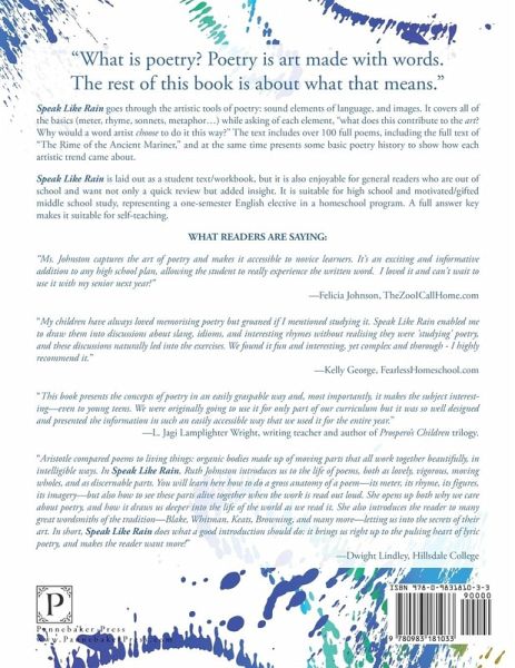"What is poetry? Poetry is art made with words. The rest of this book is about what that means." Speak Like Rain goes through the artistic tools of poetry: sound elements of language, and images. It covers all of the basics (meter, rhyme, sonnets, metaphor…) while asking of each element, "what does this contribute to the art? Why would a word artist choose to do it this way?" The text includes over 100 full poems, including the full text of "The Rime of the Ancient Mariner," and at the same time presents some basic poetry history to show how each artistic trend came about. Speak Like Rain is laid out as a student text/workbook, but it is also enjoyable for general readers who are out of school and want not only a quick review but added insight. It is suitable for high school and motivated/gifted middle school study, representing a one-semester English elective in a homeschool program. A full answer key makes it suitable for self-teaching. Digital version (pdf file suitable for tablet computer display) is available at ellenjmchenry.com. Kindle ebook is not available because the workbook layout is not suitable for flowing text.