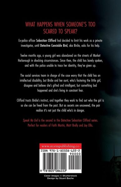 What happens when someone's too scared to speak? Ex-police officer Sebastian Clifford had decided to limit his work as a private investigator, until Detective Constable Bird, aka Birdie, asks for his help. Twelve months ago, a young girl was abandoned on the streets of Market Harborough in shocking circumstances. Since then, the child has barely spoken and with the police unable to trace her identity, they've given up. The social services team in charge of the case worry that the child has an intellectual disability but Birdie and her aunt, who's fostering the little girl, disagree and believe she's gifted and intelligent, but something bad happened and she's living in constant fear. Clifford trusts Birdie's instinct and together they work to find out who the girl is, so she can be freed from the past. But as secrets are uncovered, the pair realise it's not just the child who's in danger. Speak No Evil is the second in the Detective Sebastian Clifford series. Perfect for readers of Faith Martin, Matt Brolly and Joy Ellis.