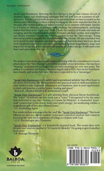 Speak Only Kindnesses: Directing the New Energy is the second volume of a set of inspired, status-quo-challenging messages that will lead you on a journey of self-discovery. This feel-good book invites us to question what we have accepted as the obvious and offers hope to those willing to engage in the mini-experiments that, in the end, offer testimonial to our inherent power as co-creators with Spirit. Similar to A Course in Miracles, it presents daily readings for contemplation, including claims that there is no "right way" to love God, the essence of female and male are merging, and the transformative power of sound can heal, soothe, and enlighten our dreary routines. Simple steps invite readers to use the "new energy" being directed at earth to amplify the manifestations they choose. We are reminded that we're loved beyond measure and that our only real task is to share that love. Speak Only Kindnesses empowers each of us to acknowledge how magnificent, huge, and impactful we are when we connect with and direct source energy. It will open your heart and open doors for you.
