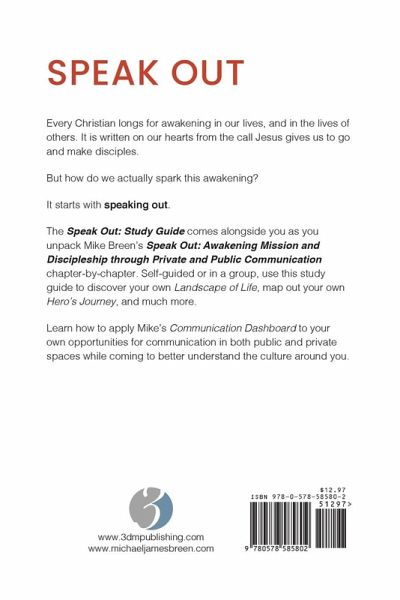 The Speak Out: Study Guide comes alongside you as you unpack Mike Breen's Speak Out: Awakening Mission and Discipleship through Private and Public Communication chapter-by-chapter. Self-guided or in a group, use this study guide to discover your own Landscape of Life, map out your own Hero's Journey, plus much more. Learn how to apply Mike's Communication Dashboard to your own opportunities for communication in both public and private spaces while coming to better understand the culture around you.