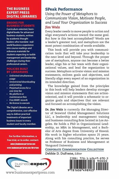 Every leader needs to move people to action and align everyone's actions toward the same goal. But how is this best accomplished? Words are a leader's greatest tool, and metaphors are the most potent combination of words available. This book will provide you with communication tools that will take your leadership to the next level and beyond. Through the proper use of metaphors, anyone can become a better leader, align his or her team with their organizational values, and lead the organization to success. Metaphors activate vision and mission statements, enliven goals and objectives, and literally align every aspect of an organization in its intended direction. The knowledge gained from the principles in this book will help leaders develop stronger vision and mission statements that are actionoriented, and it will provide a schematic to organize goals and objectives that are relevant and focused on accomplishing the vision.