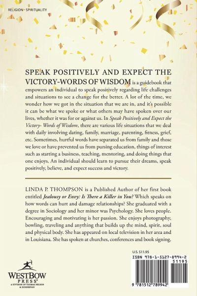 Speak Positively and Expect the Victory-Words of Wisdom is a guidebook that empowers an individual to speak positively regarding life challenges and situations to see a change for the better. A lot of the time, we wonder how we got in the situation that we are in, and it's possible it can be what we spoke or what others may have spoken over our lives, whether it was for or against us. In Speak Positively and Expect the Victory- Words of Wisdom, there are various life situations that we deal with daily involving dating, family, marriage, parenting, fitness, grief, etc. Sometimes, hurtful words have separated us from family and those we love or have prevented us from pursing education, things of interest such as starting a business, teaching, mentoring, and doing things that one enjoys. An individual should learn to pursue their dreams, speak positively, believe, and expect success and victory.