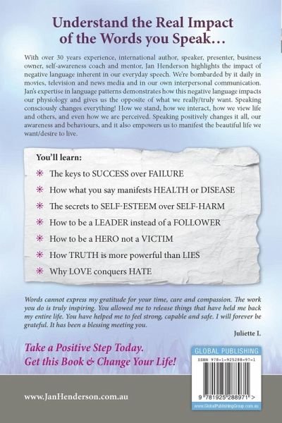 Understand the real impact of the words you speak. With over 30 years experience, international author, speaker, presenter, business owner, self-awareness coach and mentor, Jan Henderson highlights the impact of negative language inherent in our everyday speech. We're bombarded by it daily in movies, television and news media and in our own interpersonal communication. Jan's expertise in language patterns demonstrates how this negative language impacts our physiology and gives us the opposite of what we really/truly want. Speaking consciously changes everything! How we stand, how we interact, how we view life and others, and even how we are perceived. Speaking positively changes it all, our awareness and behaviours, and it also empowers us to manifest the beautiful life we want/desire to live. You'll learn:The keys to success over failure How what you say manifests health or disease The secrets to self-esteem over self-harm How to be a leader instead of a follower How to be a hero not a victim How truth is more powerful than lies Why love conquers hate Take a positive step today. Get this book and change your life!