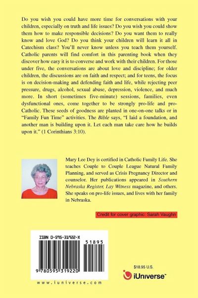 Do you wish you could have more time for conversations with your children, especially on truth and life issues? Do you wish you could show them how to make responsible decisions? Do you want them to really know and love God? Do you think your children will learn it all in Catechism class? You'll never know unless you teach them yourself. Catholic parents will find comfort in this parenting book when they discover how easy it is to converse and work with their children. For those under five, the conversations are about love and discipline; for older children, the discussions are on faith and respect; and for teens, the focus is on decision-making and defending faith and life, while rejecting peer pressure, drugs, alcohol, sexual abuse, depression, violence, and much more. In short (sometimes five-minute) sessions, families, even dysfunctional ones, come together to be strongly pro-life and pro-Catholic. These seeds of goodness are planted in one-on-one talks or in "Family Fun Time" activities. The Bible says, "I laid a foundation, and another man is building upon it. Let each man take care how he builds upon it." (1 Corinthians 3:10).