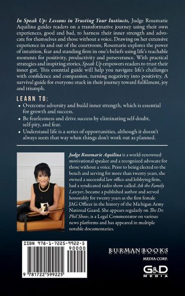 In Speak Up: Lessons in Trusting Your Instincts, Judge Rosemarie Aquilina guides readers on a transformative journey using their own experiences, good and bad, to harness their inner strength and advocate for themselves and those without a voice. Drawing on her extensive > With practical strategies and inspiring stories, Speak Up empowers readers to trust their inner gut. This essential guide will help you navigate life's challenges with confidence and compassion, turning negativity into positivity. A survival guide for everyone stuck in their journey toward fulfilment, joy and triumph.