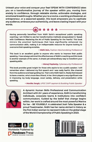 Unleash your voice and conquer your fear! SPEAK WITH CONFIDENCE takes you on a transformative journey of the speaker within you, moving from anxiety to confidence, through relatable stories, actionable strategies, and emotional breakthroughs. Whether you're a novice, a working professional, an entrepreneur, or a seasoned speaker, this book empowers you to captivate any audience, embrace your authenticity, and leave a lasting impact with your words.A dynamic Human Skills Professional and Communication Architect with 24+ years of experience, Nidhi is transforming individuals, corporate teams & Institutions into confident communicators. Guided by the belief that change begins within, her work is crafted around the most powerful Mantra for her - BE YOURSELF. A celebrated Josh Talks Speaker & a proud Toastmaster, Nidhi has her name etched in history as the first Indian woman to represent India on the global stage of the World Championship of Public Speaking in 2023.