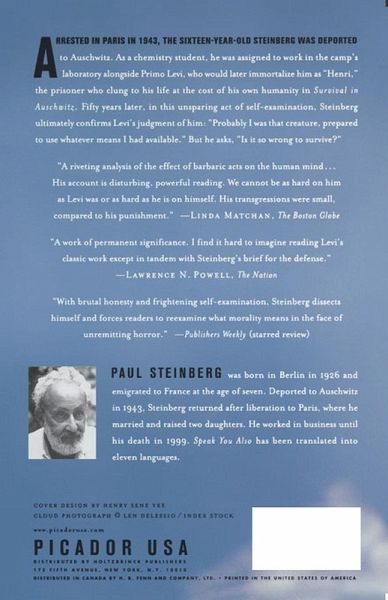 A concentration camp survivor confronts one of the most heated and vexed questions of the Holocaust: what price survival? In 1943, sixteen-year-old Paul Steinberg was arrested in Paris and deported to Auschwitz. A chemistry student, Steinberg was assigned to work in the camp's laboratory alongside Primo Levi, who would later immortalize his fellow inmate as "Henri," the ultimate survivor, the paradigm of the prisoner who clung to life at the cost of his own humanity. "One seems to glimpse a human soul," Levi wrote in If This Is a Man, "but then Henri's sad smile freezes in a cold grimace, and here he is again, intent on his hunt and his struggle; hard and distant, enclosed in armor, the enemy of all." Now, after fifty years, Steinberg speaks for himself. In an unsparing act of self-scrutiny, he traces his passage from artless adolescent to ruthless creature determined to do anything to live. He describes his strategies of survival: the boxing matches he staged for the camp commanders, the English POWs he exploited, the maneuvers and tactics he applied with cold competence. Ultimately, he confirms Levi's judgment: "No doubt he saw straight. I probably was that creature, prepared to use whatever means I had available." But, he asks, "Is it so wrong to survive?" Brave and rare, Speak You Also is a profound and necessary addition to the body of Holocaust writing: a survivor's reckoning with culpability and survival.