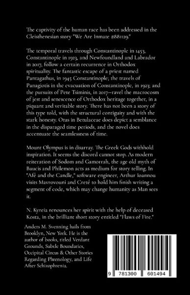 The captivity of the human race has been addressed in the Cleisthenesian story, "We Are Inmate #881129." The temporal travels through Constantinople in 1453, Constantinople in 1923, and Newfoundland and Labrador in the 2017, follow a certain recurrence in Orthodox spirituality. The fantastic escape of a priest named Pantagathus, in 1453 Constantinople; the travels of Panagiotis in the evacuation of Constantinople in 1923; and the pursuits of Pete Tsiminis, in 2017-ravel the macrocosm of jest and the senescence of Orthodox heritage together, in a piquant and veritable story. There has not been a story of this type told, with the structural contiguity and with the stark honesty. Otus in Betuaceæ does depict a semblance in the disparaged time periods, and the novel does accentuate the seamlessness of time. Mount Olympus is in disarray. The Greek Gods withhold inspiration. It seems the discord cannot stop. As modern reiteration of Sodom and Gomorrah, the age old myth of Baucis and Philemon acts as medium for storytelling. In "Afé and the Candle," software engineer, Arthur Ioannou visits Mavrovouni and Creté to help him finish writing a segment of code, which may change humanity as Man sees it. N. Kyreia renounces her spirit, in the brilliant novella entitled "Flaws of Fire."