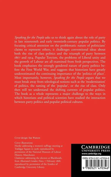 Speaking for the People, first published in 1998, draws our attention to the problematic nature of politicians' claims to represent others, and in doing so it challenges conventional ideas about both the rise of class politics, and the triumph of party between 1867 and 1914. The book emphasises the strongly gendered nature of party politics before the First World War, and suggests that historians have greatly underestimated the continuing importance of the 'politics of place'. Most importantly, however, Speaking for the People argues that we must break away from teleological notions such as the 'modernisation' of politics, the taming of the 'popular', or the rise of class. Only then will we understand the shifting currents of popular politics. Speaking for the People represents a major challenge to the ways in which historians and political scientists have studied the interaction between party politics and popular political cultures.