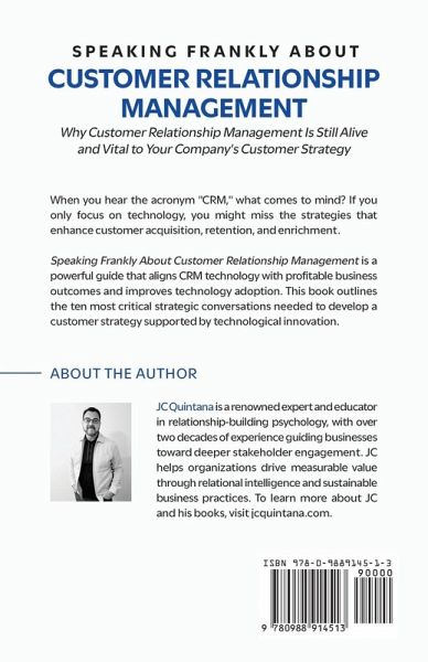 Foreward by Dr. Dan Dana (Conflict Resolution) & John Marchica (The Accountable Organization) Speaking Frankly About Customer Relationship Management is a comprehensive guide to the strategic and technological elements of building and maintaining solid customer relationships. Author JC Quintana provides practical advice and real-world examples to help readers develop effective strategies for managing customer relationships. Through clear and concise explanations of customer-focused strategy and technology enablement, readers will learn how to create a culture of customer-company equity that fosters value co-creation and drives business success. JC addresses the challenges of managing customer relationships in the digital age, offering insights into the use of technology to enhance customer experiences. Whether you're a business owner, manager, customer service representative, or seller, Speaking Frankly About Customer Relationship Management is essential for anyone looking to improve their customer relationship management skills.