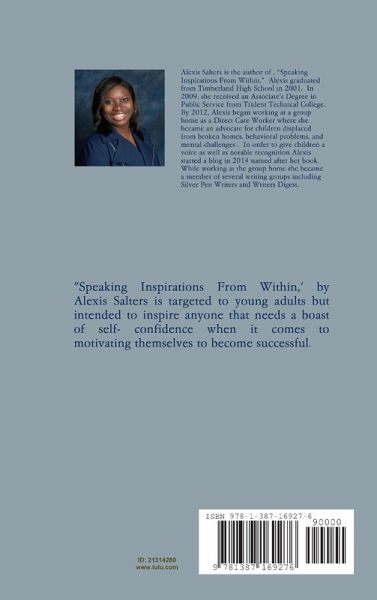 "Speaking Inspirations From Within," is targeted to young adults but intended to inspire anyone that needs a boast of self-confidence when it comes to motivating themselves to become successful.