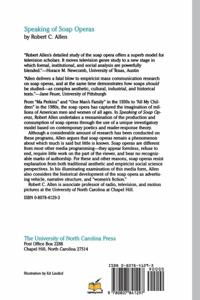 From “Ma Perkins” and “One Man’s Family” in the 1930s to “All My Children” in the 1980s, the soap opera has capture the imagination of millions of American men and women of all ages. In Speaking of Soap Operas, Robert Allen undertakes a reexamination of the production and consumption of soap operas through the use of a unique investigatory model based on contemporary poetics and reader-response theory. Although a considerable amount of research has been conducted on these programs, Allen argues that soap operas remain a phenomenon about which much is said but little is known. Soap operas are different from most other media programming — they appear formless, refuse to end, require little work on the part of the viewer, and bear no recognizable marks of authorship. For these and other reasons, soap operas resist explanation from both traditional aesthetic and empiricist social science perspectives. The daytime dramatic serials generate nearly a billion dollars in revenue each year for the three commercial networks. Allen discusses in detail the economic and institutional functions of these programs in addition to the context of their production. He also considers the historical development of the soap opera as advertising vehicle, narrative structure and “women’s fiction.” Speaking of Soap Operas is based on the author’s own experiences as a soap opera viewer; extensive interviews with soap opera writers, producers, and actors; and the papers of Irna Phillips, creator of dozens of successful ratio and television soap operas. Drawing also upon trade publications, popular periodicals, and broadcast archives, this work is an important contribution to the field of mass communication.