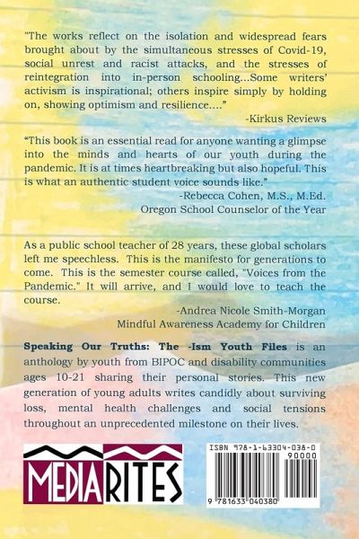 "It's amazing to believe that what was going to be the best year ever tuned into the beginning of what was thought to be the end." Speaking Our Truths: The -Ism Youth Files is an anthology by youth ages 10-21 from BIPOC and disability communities sharing their personal stories. This new generation of young adults writes candidly about surviving loss, mental health challenges, and social tensions through an unprecedented milestone in their lives. Written by twenty youth authors, geared towards youth, this anthology weaves together different perspectives on mental health and wellness. All authors are from the BIPOC and disability communities, which were disproportionately affected by COVID-19, a generation forever changed by an unprecedented pandemic and whose voices have not really been heard, until now. Detailing personal challenges and struggles through art, graphic novels, poetry, and prose, these youth express profound insight and vulnerability about how their lives have been changed and that of their loved ones and their communities. A diversity of voices and mediums, this book is great for fans of anthologies. Young adults will see themselves in these authors. Adults, educators, and mental health professionals will gain an understanding of a new generation of youth and can hopefully better communicate with and address their concerns and needs. Recommended for ages 13+.