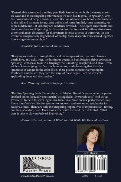 "Remarkable actress and dazzling poet, Beth Ruscio knows both the many masks we wear and those singular performances we each live to give. In SPEAKING PARTS, her powerful collection of poems, we become the audience to the self and its many faces . . ." -David St. John, author of THE AURORAS