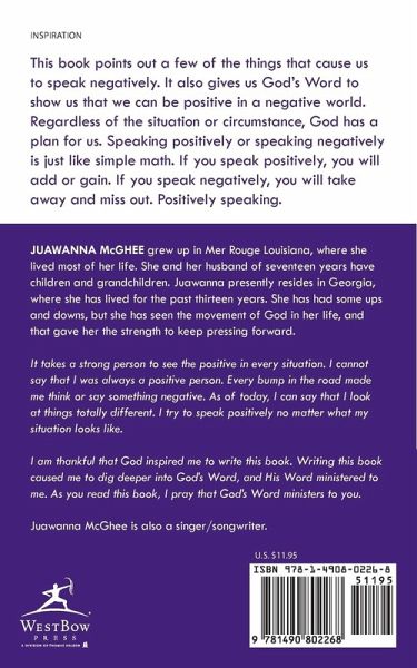 This book points out a few of the things that cause us to speak negatively. It also gives us God's Word to show us that we can be positive in a negative world. Regardless of the situation or circumstance, God has a plan for us. Speaking positively or speaking negatively is just like simple math. If you speak positively, you will add or gain. If you speak negatively, you will take away and miss out. Positively speaking.