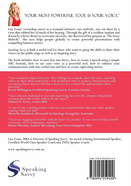 The Art of Speaking and Storytelling Do you have something to say but you are not sure how to say it? Are you looking for a way to create a memorable experience for your audience? Do you need the secret to creating and sharing stories that move people? Then you need Speaking Savvy - The Art of Speaking and Storytelling. This book is full of tools and tricks on how you can be a far more effective storyteller and speaker. If you are a little shy or don't know where to start - have no fear because that is where I was! I used to be very shy and afraid of public speaking. It took a life-changing illness to realise that it doesn't help anyone for me to remain scared to speak out when I have a message worth sharing. So now I am driven to help others to use their voice so they can speak up and share their stories and messages in a way that is powerful and compelling. The first step is to learn some of the tips, tools, and tricks so that you can confidently speak in front of an audience any size. The next step is to put those tools into action, and I have some extra resources including videos and templates to help you do that Speaking Savvy - The Art of Speaking and Storytelling will help you share your message. To make sure you get a real kick start down the path, I have created an initial launch package that includes some extra resources for you. Some of the speaking elements it covers include: How to turn 'fear' into 'fierce.' How to create a speech using a simple ABC framework How to plan a successful presentation How to use your voice as a powerful tool How to enhance your communication with non-verbal cues Understand how to use storytelling a compelling medium, and much more