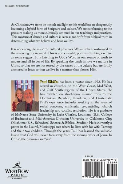 As Christians, we are to be the salt and light to this world but are dangerously becoming a hybrid form of Scripture and culture. We are conforming to the pressure making us more culturally centered in our teachings and practices. This mixture of church and culture is seen as we drift from biblical truth in determining what we believe and how we live. It is not enough to resist the cultural pressures. We must be transformed by the renewing of our mind. This is not a mental, positive-thinking exercise as some suggest. It is listening to God's Word as our source of truth to understand all issues of life. By speaking the truth in love we mature in Christ so that we are not tossed by the waves of the culture but are firmly anchored in Jesus so that we live in a manner that pleases Him.