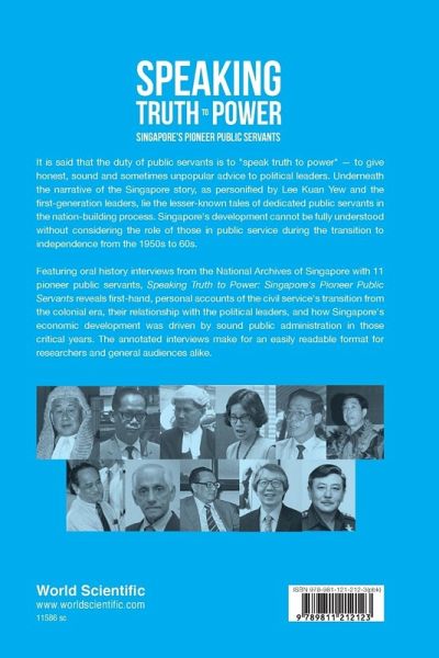 It is said that the duty of public servants is to ""speak truth to power"" - to give honest, sound and sometimes unpopular advice to political leaders. Underneath the narrative of the Singapore story, as personified by Lee Kuan Yew and the first-generation leaders, lie the lesser-known tales of dedicated public servants in the nation-building process. Singapore's development cannot be fully understood without considering the role of those in public service during the transition to independence from the 1950s to 60s. Featuring oral history interviews from the National Archives of Singapore with 11 pioneer public servants, Speaking Truth to Power: Singapore's Pioneer Public Servants reveals first-hand, personal accounts of the civil service's transition from the colonial era, their relationship with the political leaders, and how Singapore's economic development was driven by sound public administration in those critical years. The annotated interviews make for an easily readable format for researchers and general audiences alike.