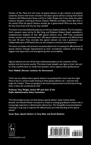 Viewers of The Thick of It will know of special advisers as spin doctors and political careerists. Several well-known ministers have been special advisers, among them David Cameron, Ed Miliband, Jack Straw and Vince Cable. People also know about the public relations disasters involving Jo Moore, Damian McBride and Adam Smith. But what is the reality? What do special advisers actually do in government? Who are they, where do they come from, and why are they needed? This book is the most detailed study yet carried out of special advisers. The Constitution Unit's research team, led by Dr Ben Yong and Professor Robert Hazell, assembled a comprehensive database of over 600 special advisers since 1979. They conducted written surveys, and interviewed over 100 special advisers, ministers and officials from the past thirty years. They conclude that special advisers are now a permanent and indispensable part of Whitehall, but are still treated as transient and temporary. The book concludes with practical recommendations for increasing the effectiveness of special advisers through improvements to their recruitment, induction and training, support and supervision, and strengthening their accountability.