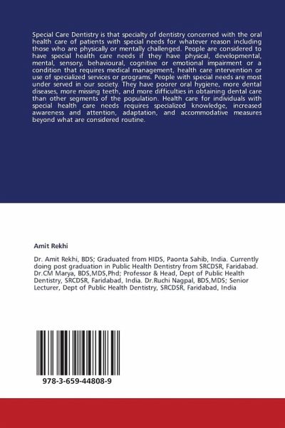 Special Care Dentistry is that specialty of dentistry concerned with the oral health care of patients with special needs for whatever reason including those who are physically or mentally challenged. People are considered to have special health care needs if they have physical, developmental, mental, sensory, behavioural, cognitive or emotional impairment or a condition that requires medical management, health care intervention or use of specialized services or programs. People with special needs are most under served in our society. They have poorer oral hygiene, more dental diseases, more missing teeth, and more difficulties in obtaining dental care than other segments of the population. Health care for individuals with special health care needs requires specialized knowledge, increased awareness and attention, adaptation, and accommodative measures beyond what are considered routine.