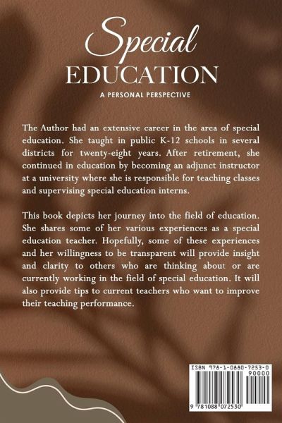 The Author had an extensive career in the area of special education. She taught in public K-12 schools in several districts for twenty-eight years. After retirement, she continued in education by becoming an adjunct instructor at a university where she is responsible for teaching classes and supervising special education interns. This book depicts her journey into the field of education. She shares some of her various experiences as a special education teacher. Hopefully, some of these experiences and her willingness to be transparent will provide insight and clarity to others who are thinking about or are currently working in the field of special education. It will also provide tips to current teachers who want to improve their teaching performance.