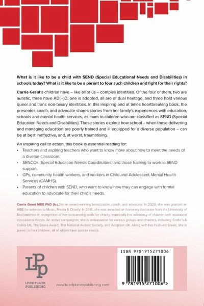 What is it like to be a child with SEND (Special Educational Needs and Disabilities) in schools today? What is it like to be a parent to four such children and fight for their rights? Carrie Grant's children have - like all of us - complex identities. Of the four of them, two are autistic, three have AD(H)D, one is adopted, all are of dual heritage, and three hold various queer and trans non-binary identities. In this inspiring and at times heartbreaking book, the presenter, coach, and advocate shares stories from her family's experiences with education, schools and mental health services, as mum to children who are classified as SEND (Special Education Needs and Disabilities). These stories explore how school - when those delivering and managing education are poorly trained and equipped for a diverse population - can be at best ineffective, and, at worst, traumatising. An inspiring call-to-action, this book is essential reading for: Teachers and aspiring teachers who want to know more about how to meet the needs of a diverse classroom. SENCOs (Special Education Needs Coordinators) and those training to work in SEND support. GPs, community health workers, and workers in Child and Adolescent Mental Health Services (CAMHS). Parents of children with SEND, who want to know how they can engage with formal education to advocate for their child's needs.